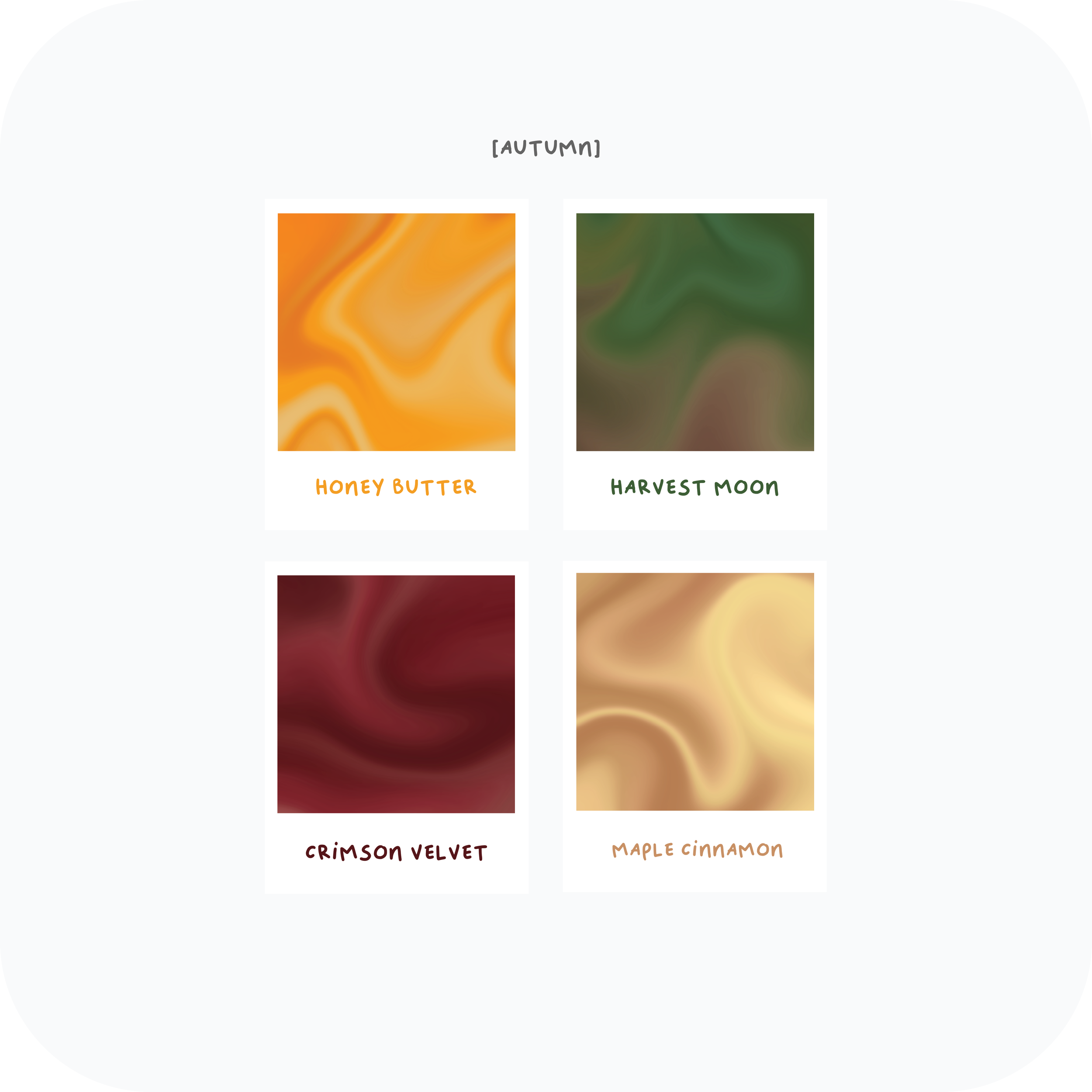a new take on the autumn collection! a new and improved version! here are 4 autumn palettes, each inspired by something that would remind you of the fall season or weather: the changing colour of the leaves, a patch of ripe pumpkins, the taste and smell of fall classic. i hope these palettes get you ready for the fall weather thats coming up soon!